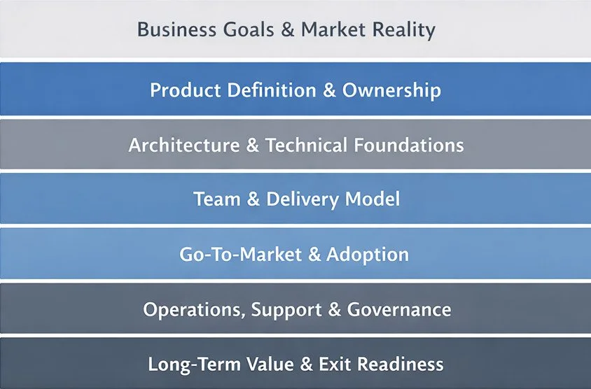 This guide forms the foundation of our Software Product Operating System (SPOS): a structured way to ensure the major business, technical, and operational decisions involved in building, scaling, maintaining, and eventually selling custom software are visible and intentional over time.